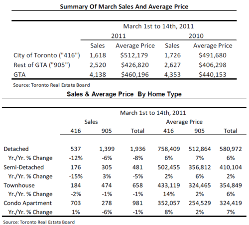 Greater Toronto REALTORS® reported 4,138 sales duringthe first two weeks of March 2011 – a five per cent decrease compared to the firsttwo weeks of March 2010. The number of new listings also dipped – down by 15per cent compared to the same period last year.