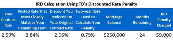 The key difference in the Discounted Rate IRD method is that the lender takes your contract rate and compares it to the posted rate that most closely matches your remaining term MINUS the original discount you got off of their five-year posted rate.