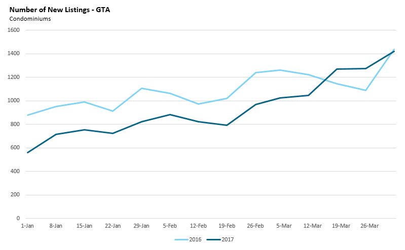 The GTA’s condo market is showing an entirely different trend from the one we are seeing in the freehold market. New listings in Toronto’s condo market were down by 21% during the first two and a half months of 2017. The third week of March saw new listings increase by 11% followed by a 17% increase during the fourth week of March. During the first week of April new listings were down by 1%.