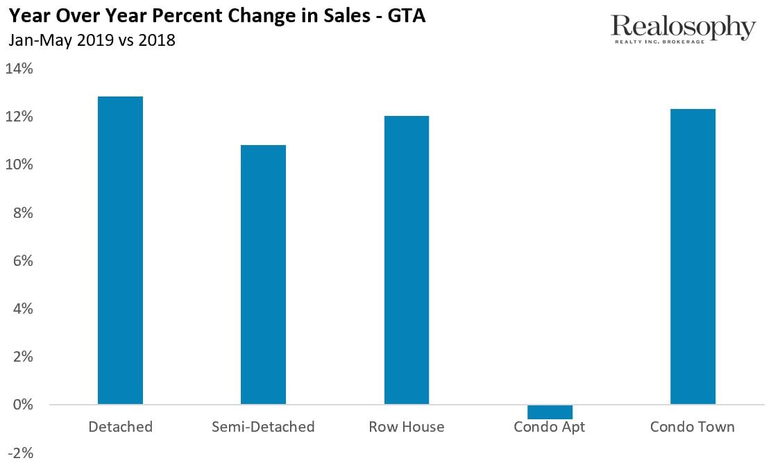 Condo sales are down slightly for the first five months of 2019 compared to last year with all other house types posting double digit gains in sales.