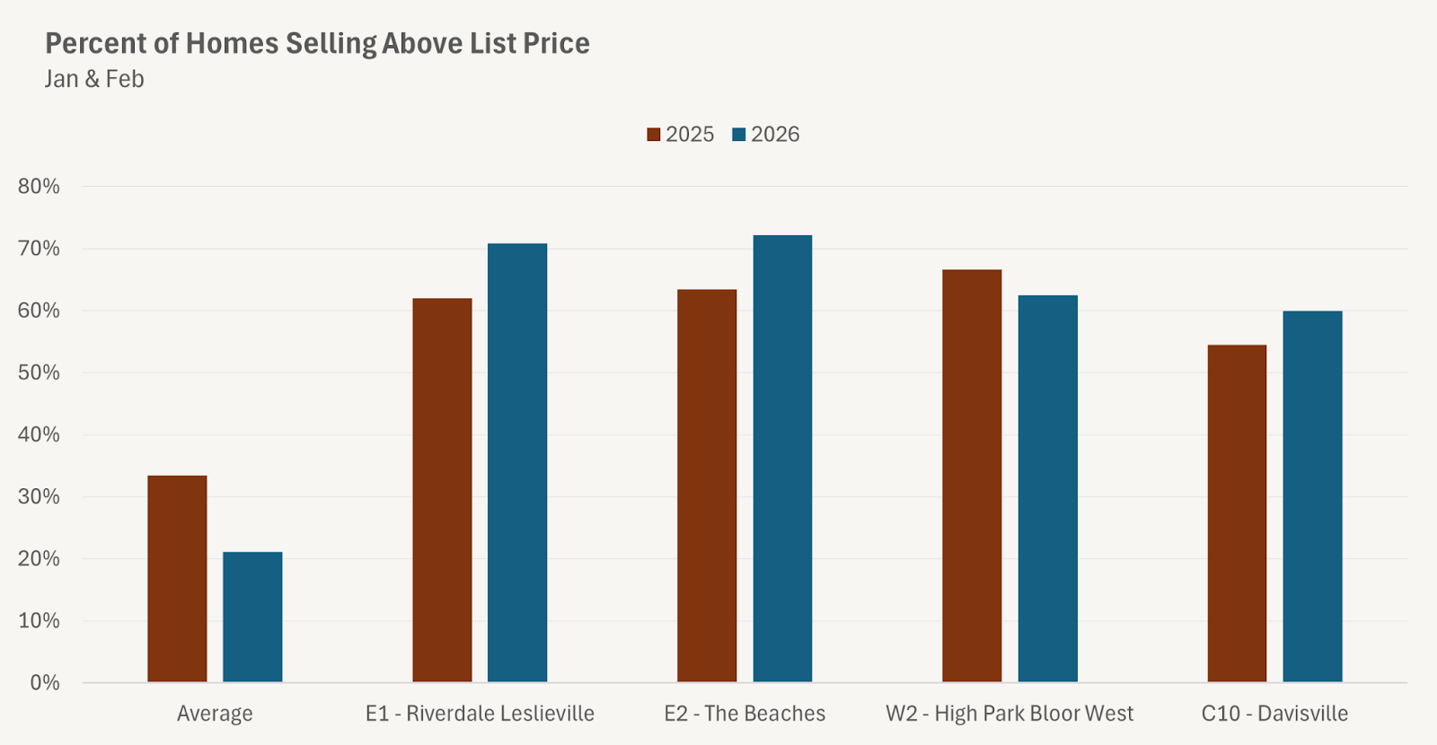 Last year, these same neighbourhoods were also outperforming the GTA average. But the overall market was stronger then. A much larger share of homes across the region were selling over asking, which meant the gap between these neighbourhoods and the rest of the market was narrower.