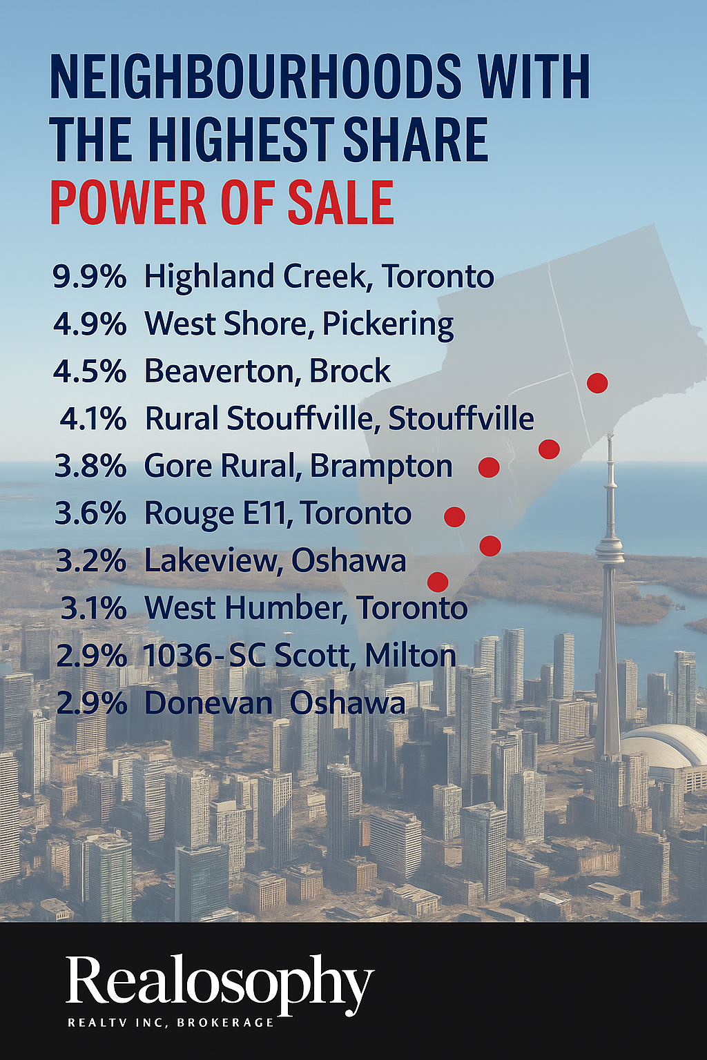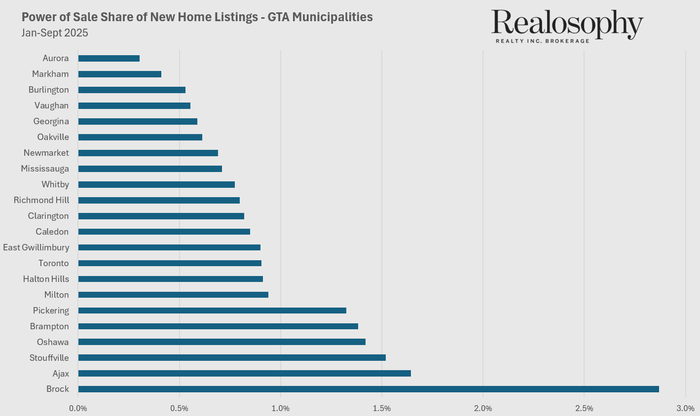 When we look at where these Power of Sale listings are happening, the highest shares are in parts of the GTA that saw the biggest surge in prices and demand during the pandemic — as buyers rushed from Toronto to the suburbs and exurbs. Municipalities like Brock, Ajax, Stouffville, Oshawa, and Brampton stand out with the largest share of POS listings this year.
