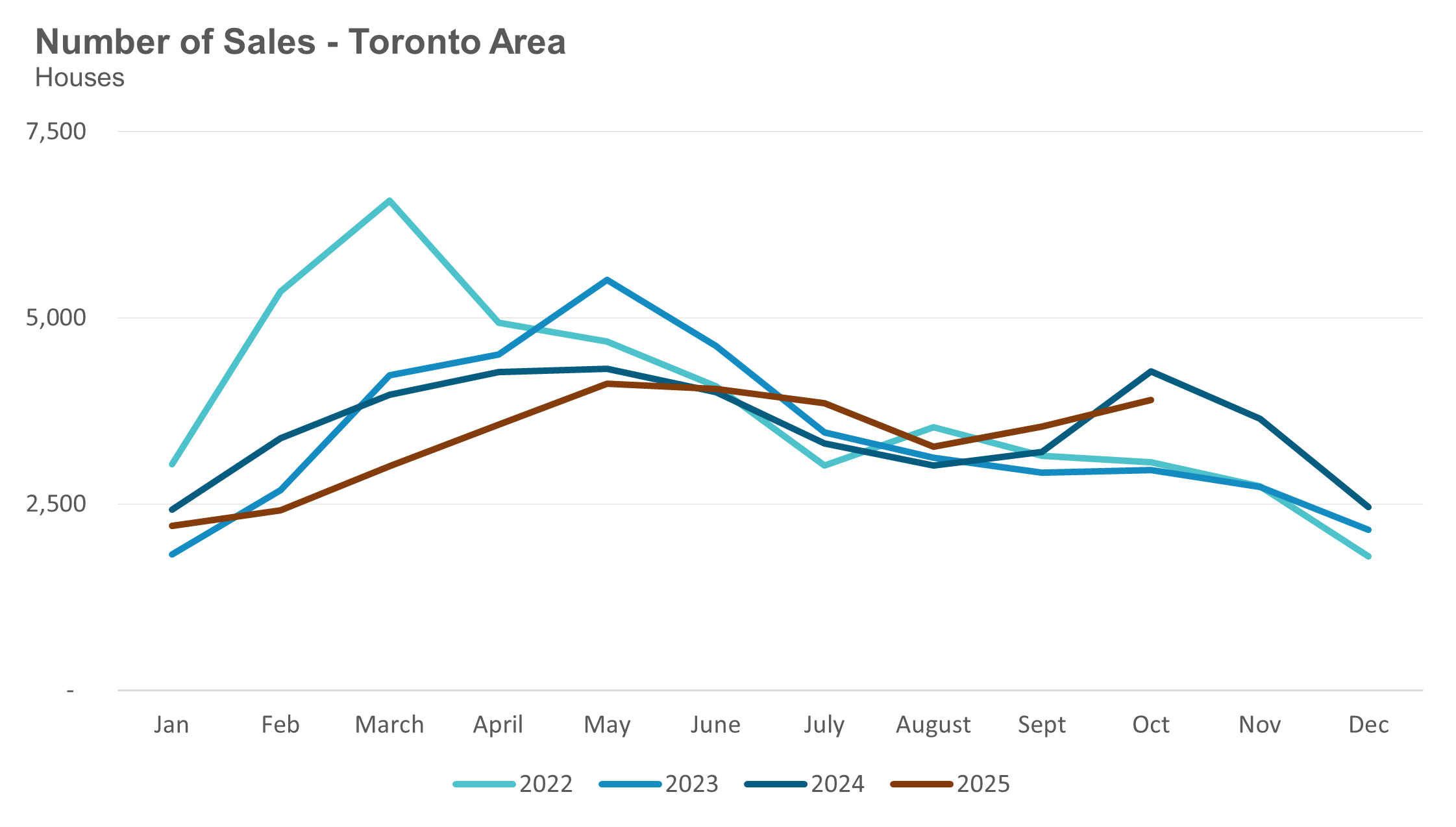 House sales (low-rise freehold detached, semi-detached, townhouse, etc.) in the Greater Toronto Area (GTA) in October 2025 were down 7% compared to the same month last year.