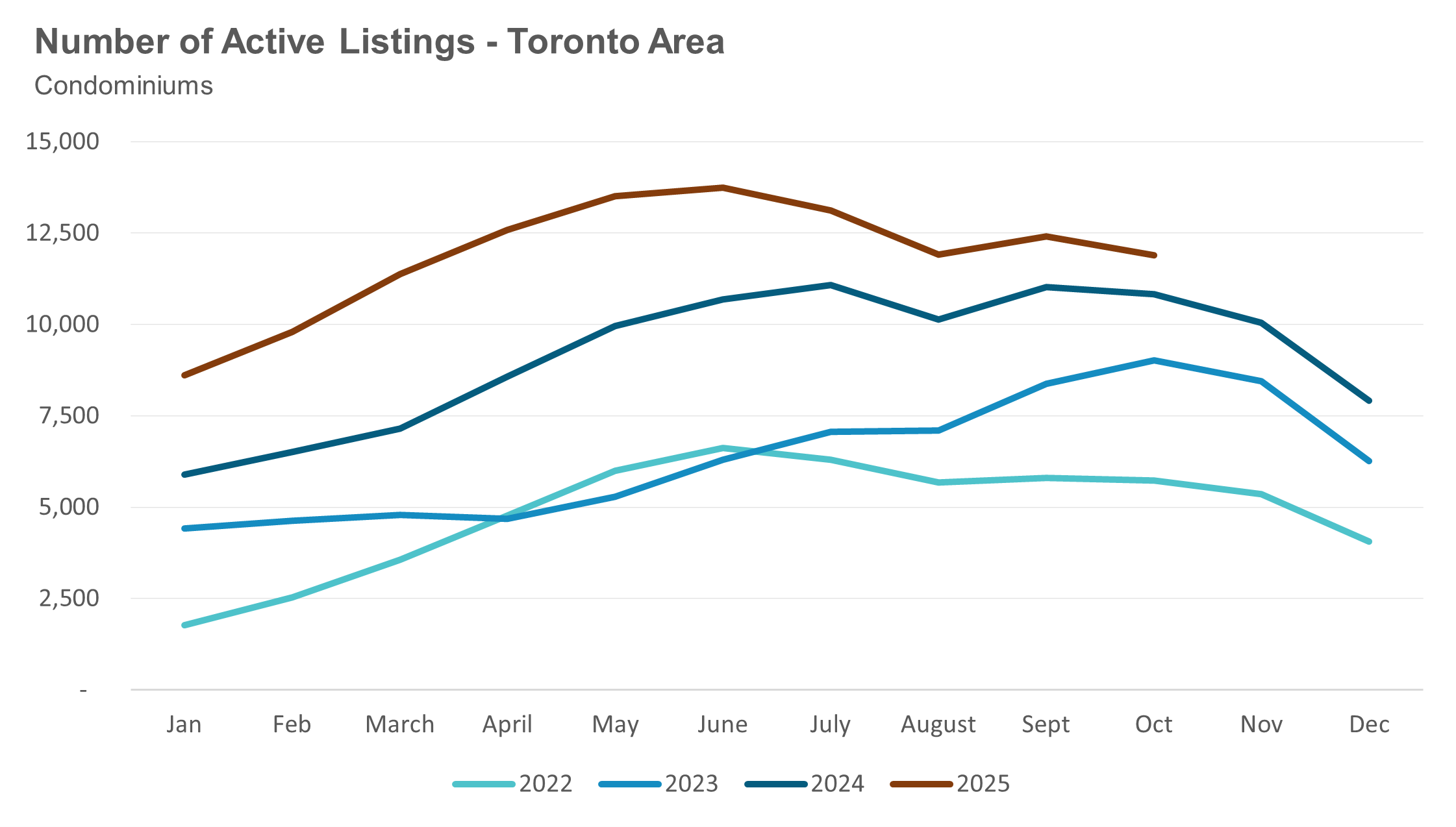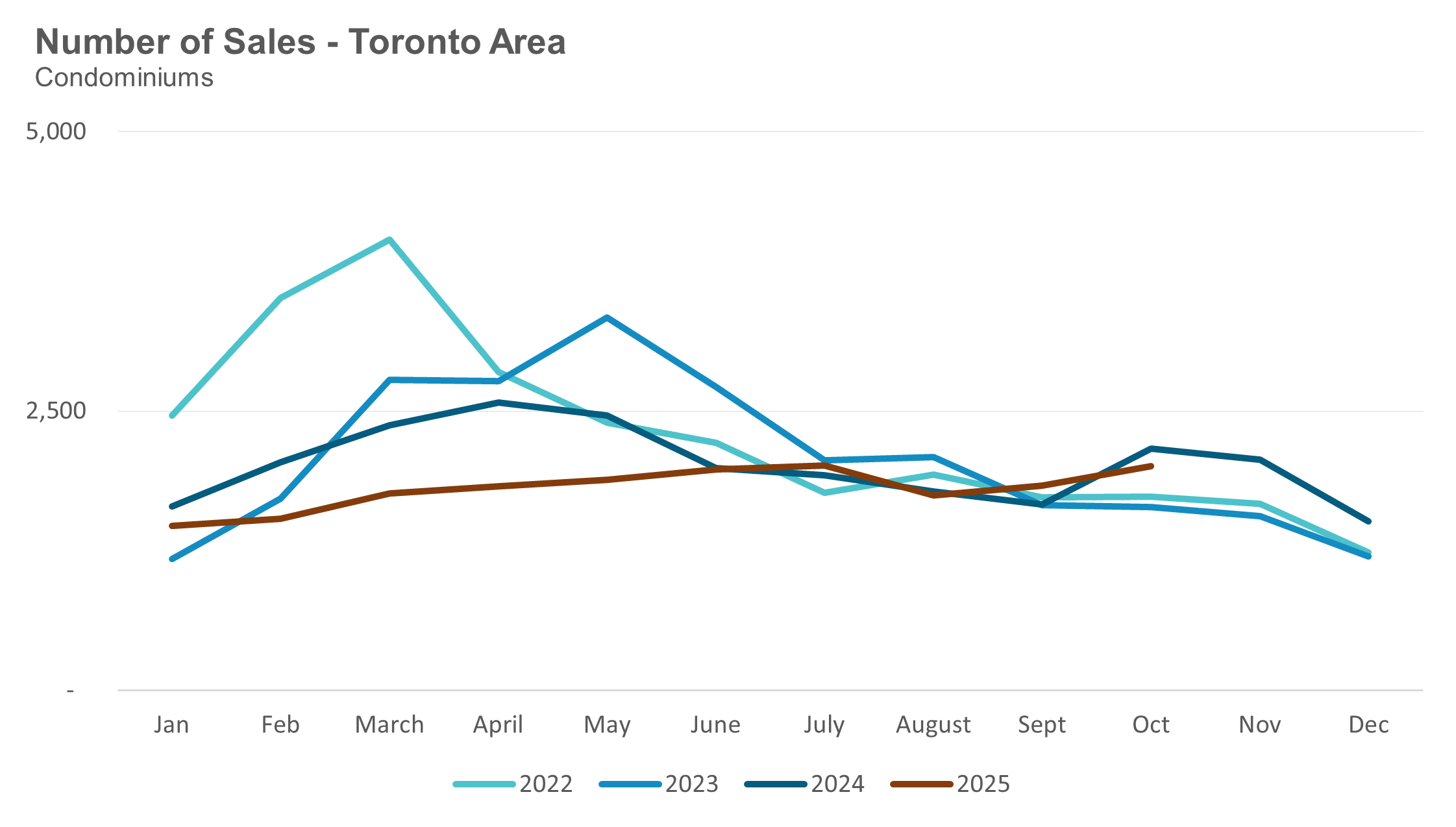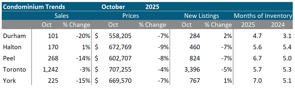 Condo (condominiums, including condo apartments, condo townhouses, etc.) sales in the Toronto area in October 2025 were down 7% compared to the same month last year.