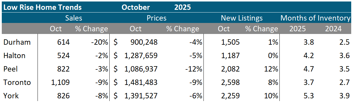 Active listings were up 28% from last year, as new listing volumes continue to run well ahead of 2024 levels. With softer demand and rising supply, average and median prices for low-rise homes fell roughly 7% year-over-year, with Peel Region down 12% and Durham down 4%.