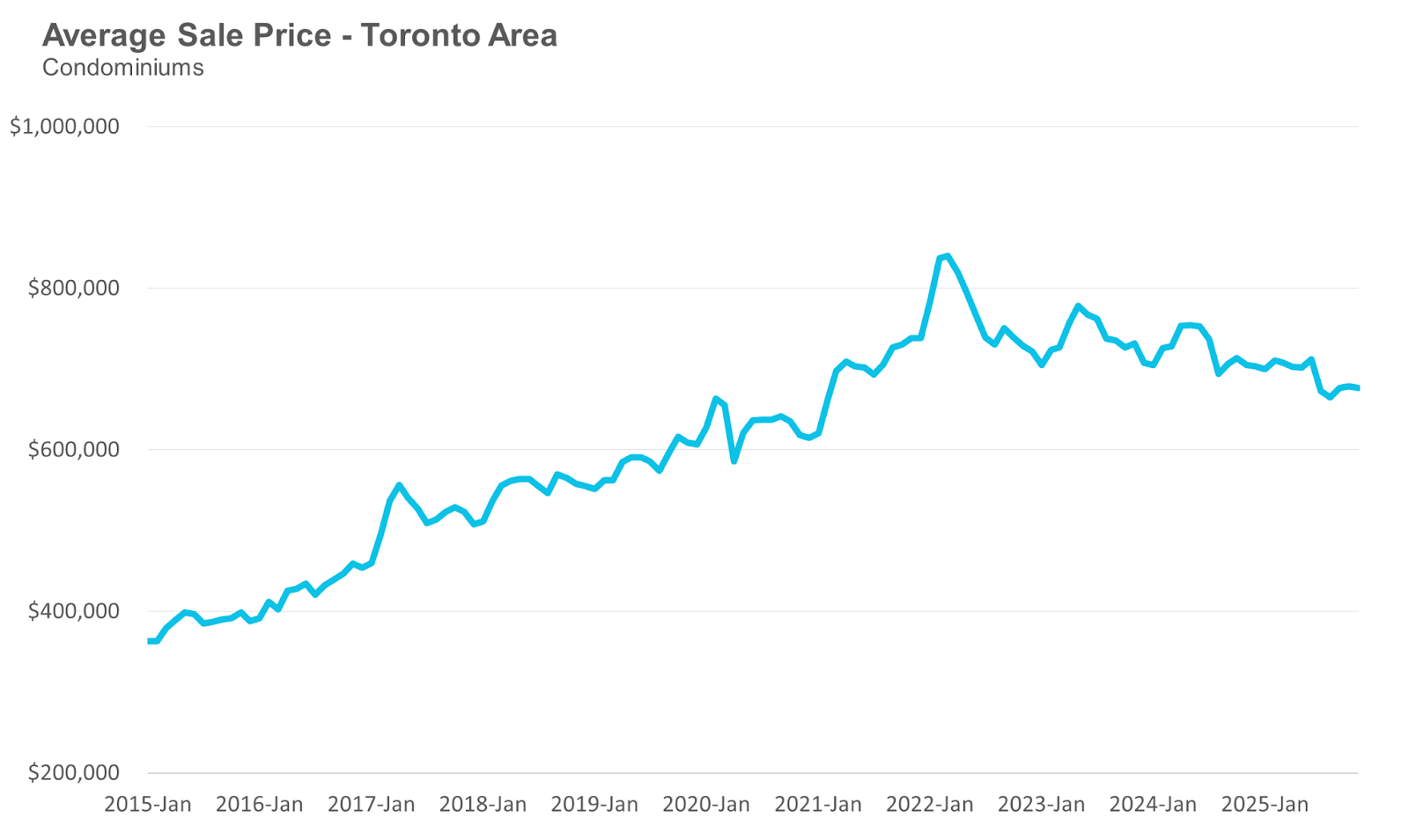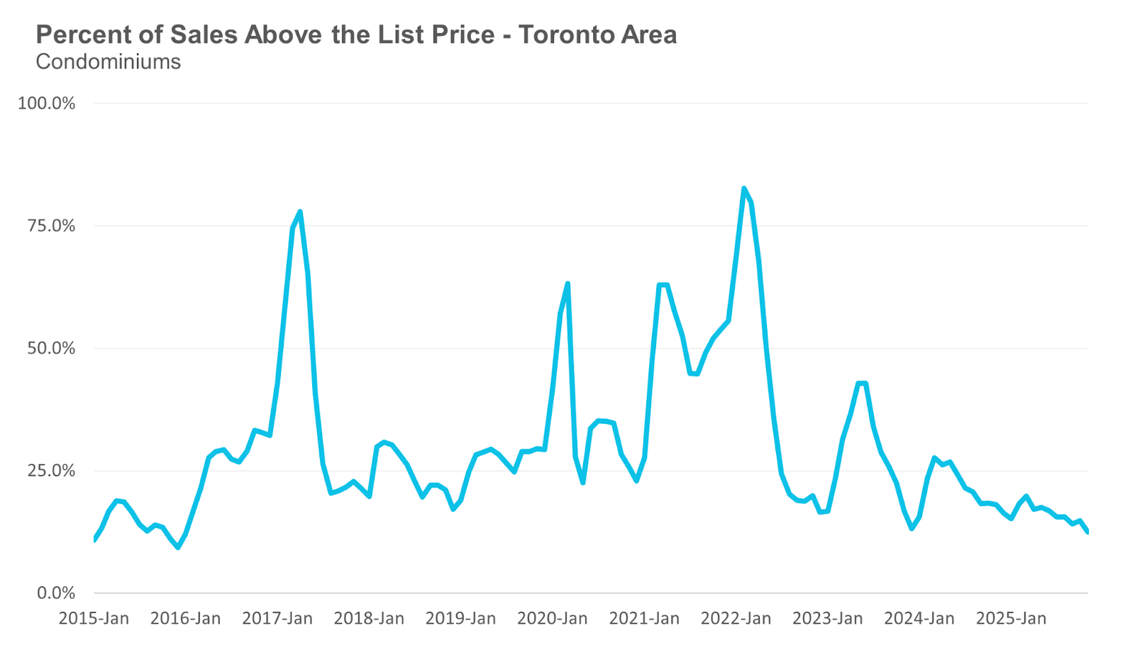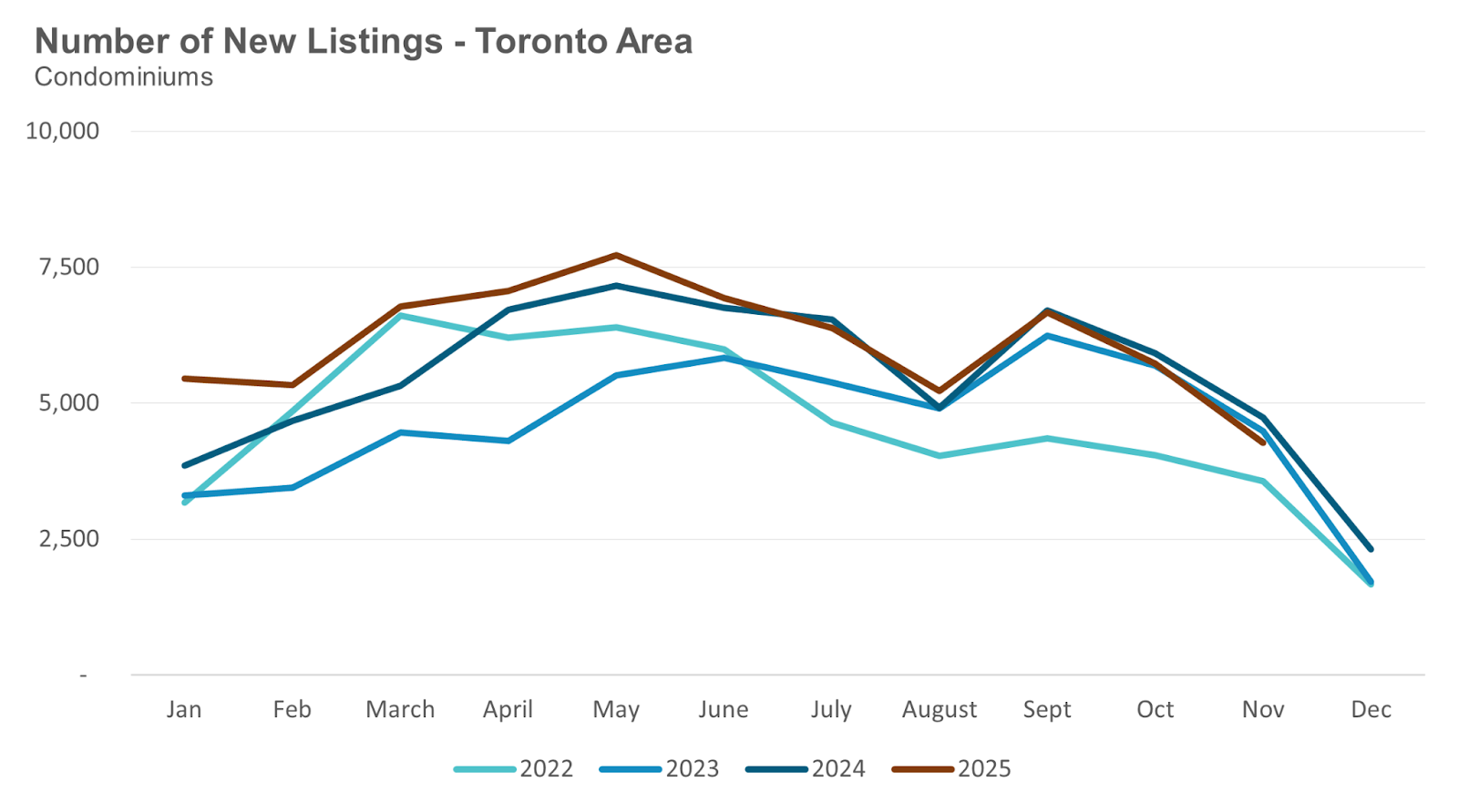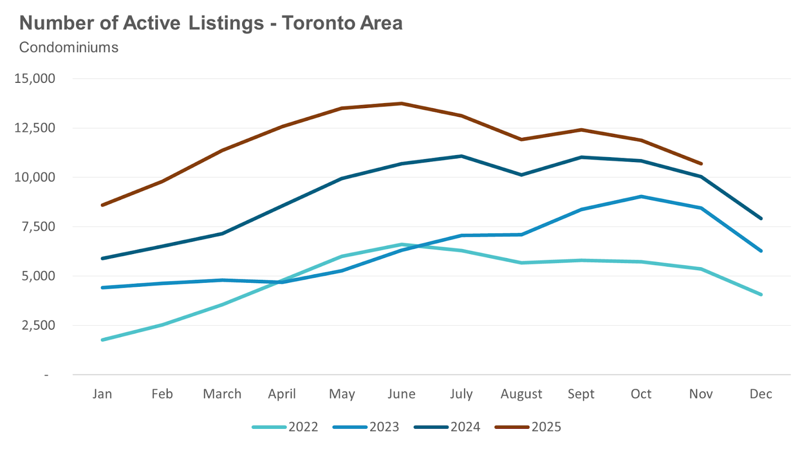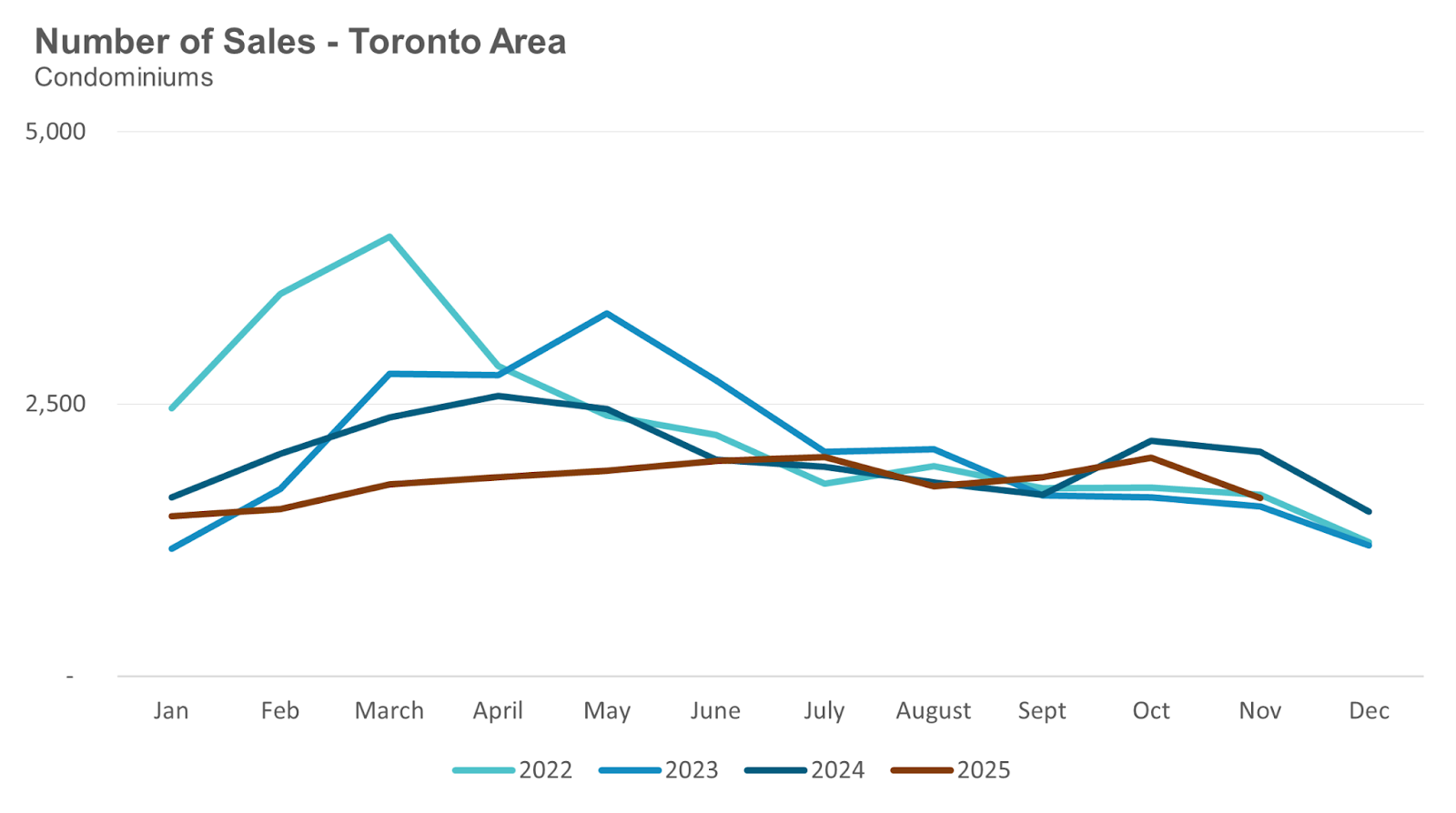 Condo (condominiums, including condo apartments, condo townhouses, etc.) sales in the Toronto area in November 2025 were down 21% compared to the same month last year.