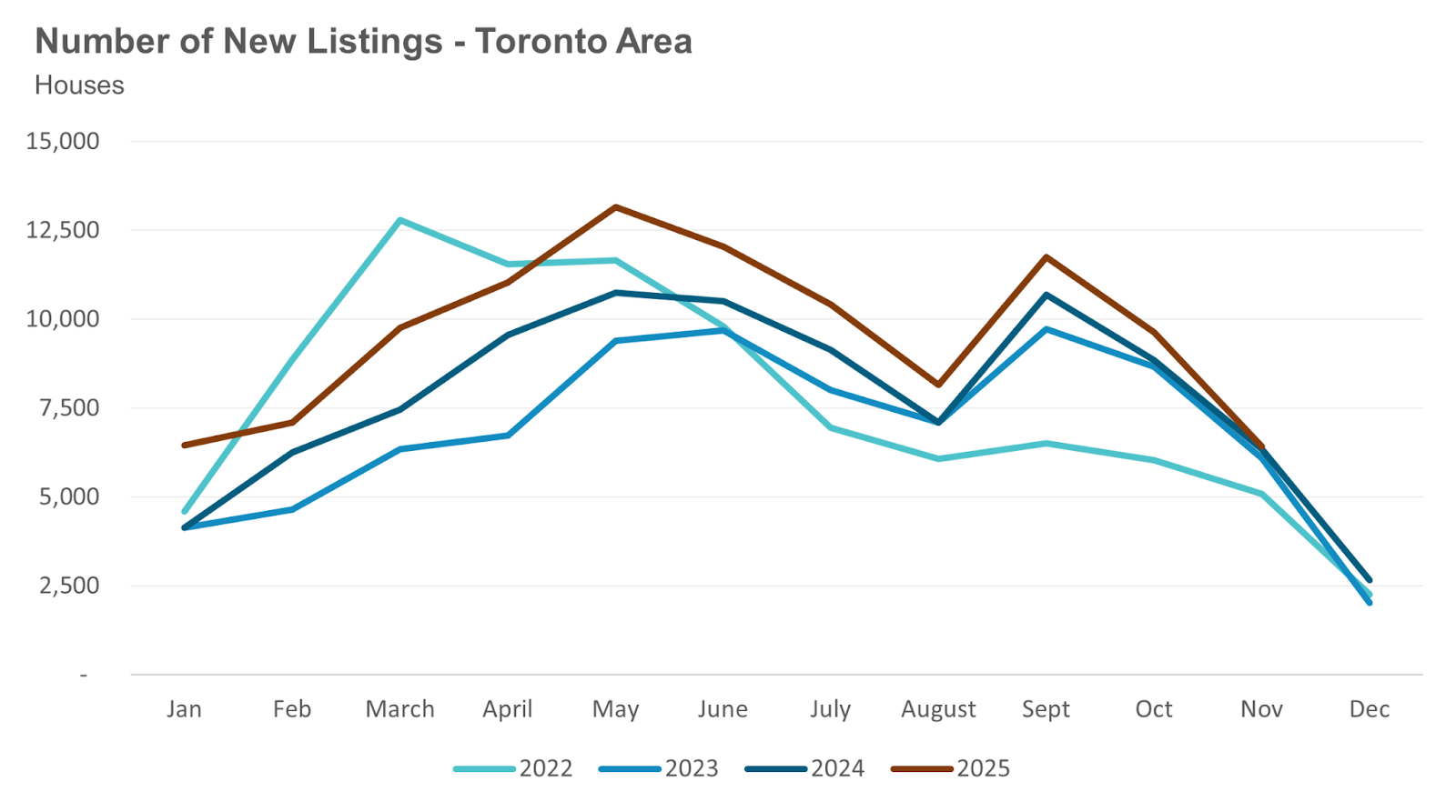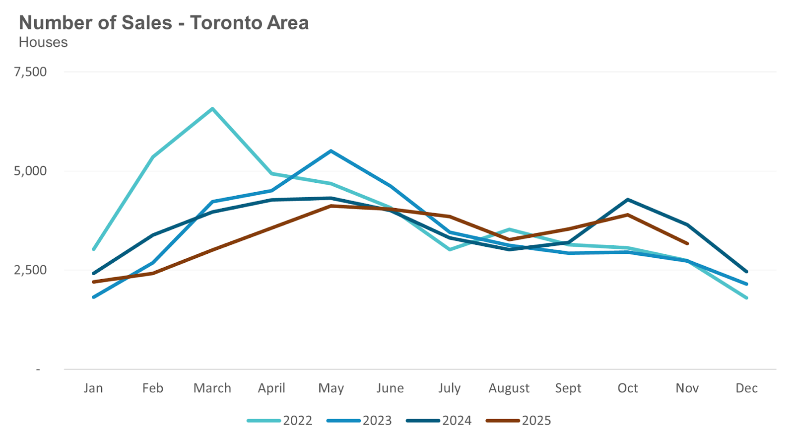 House sales (low-rise freehold detached, semi-detached, townhouse, etc.) in the Greater Toronto Area (GTA) in November 2025 were down 13% compared to the same month last year.