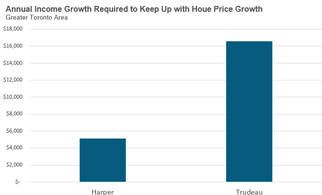 When we look at the annual rate of appreciation in house prices, we find that prices on average had appreciated by 6% per year under Stephen Harper compared to 11% under Justin Trudeau.