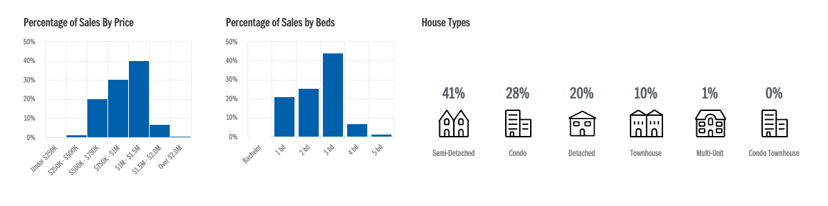 Other key metrics (such as percentage of sales by price, percentage of sales by number of beds and housing type) help you understand whether the neighbourhood you're looking at has the type of housing you are interested in (see screenshot above). This breakout also gives you a real sense of what type of housing you are most likely to find on offer in a neighbourhood - and because the numbers are refreshed every month, you keep on top of the latest changes, like more condos coming into a particular area.
