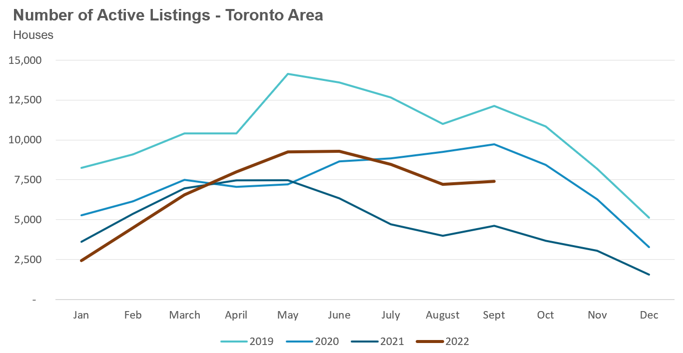 Looking at the most recent statistics for the Toronto area market for the latest month, September 2022, we are seeing that home prices have plateaued since July even as sales numbers declined because new listings and thus overall inventory remains low.