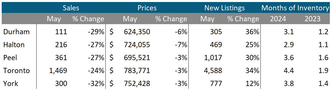 Condo sales were down by over 20% in all regions in May. Average prices were also down across the GTA. New listings and MOI were well above last year’s level for all regions.