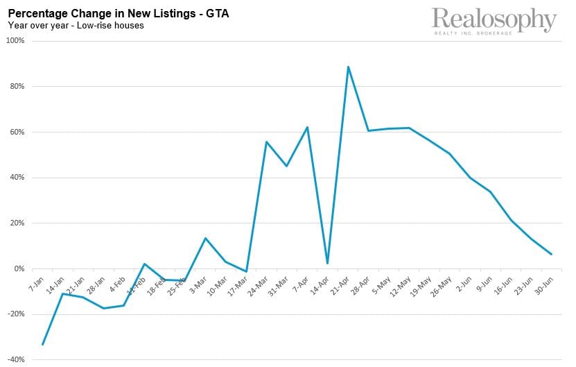 When we noticed the rapid shift in the GTA market we began tracking changes in sales and new listings weekly to get a better sense of how the market was moving. This approach gave us a timelier look at how rapidly the housing market was changing when compared to looking at monthly figures and offers some insight into why prices declined as quickly as they did.