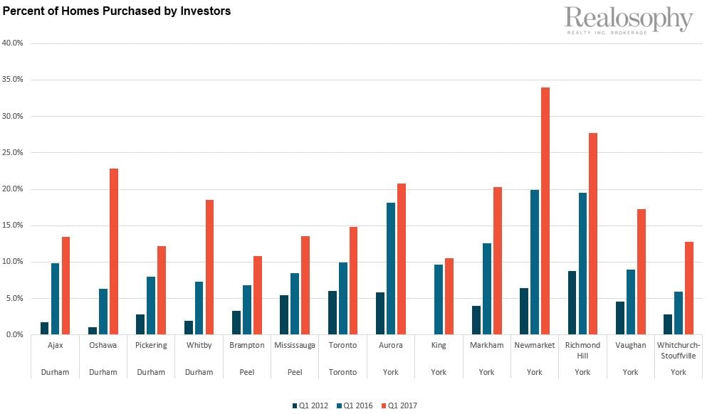 Whitby and Oshawa in Durham Region saw the biggest year-over-year increase in such investor sales from 2016 to 2017, with sales more than doubling in Whitby and jumping from 6.3% to 23% in Oshawa.