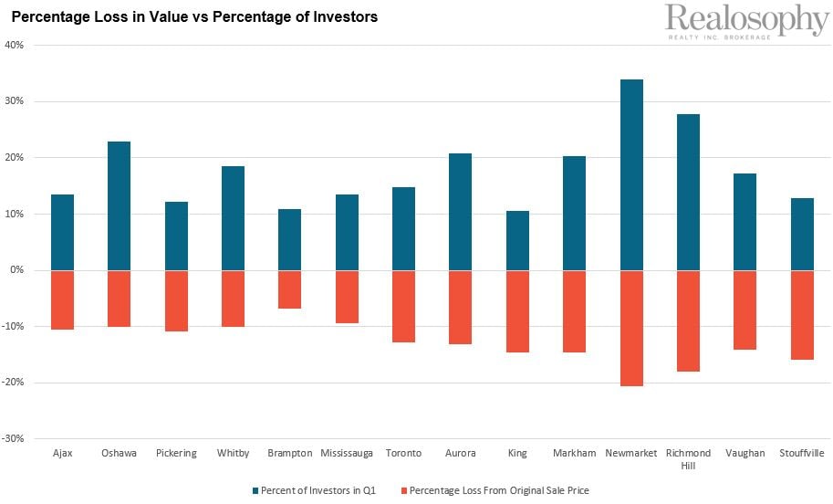 The average percentage decline in prices for these combined 988 properties was 12%, but we found significant variability across the GTA. In Newmarket, prices declined 21% from their original sale price, or $238,866 while Richmond Hill saw prices fall 18% or $317,091 from their original sale price.