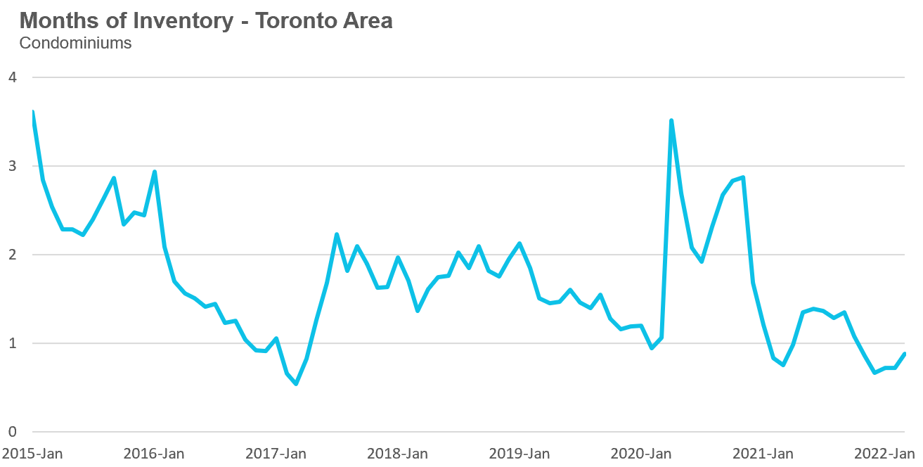 Condo (condominiums, including condo apartments, condo townhouses, etc.) sales in the Toronto area in March 2022 were down 19% over last yea,r but well ahead of volumes in 2019 and 2020.
