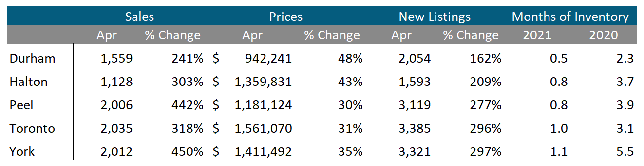 Sales across all five regions in the GTA were up significantly in April as were average prices. Despite the increase in new listings inventory levels are at or below 1 month across the entire GTA.